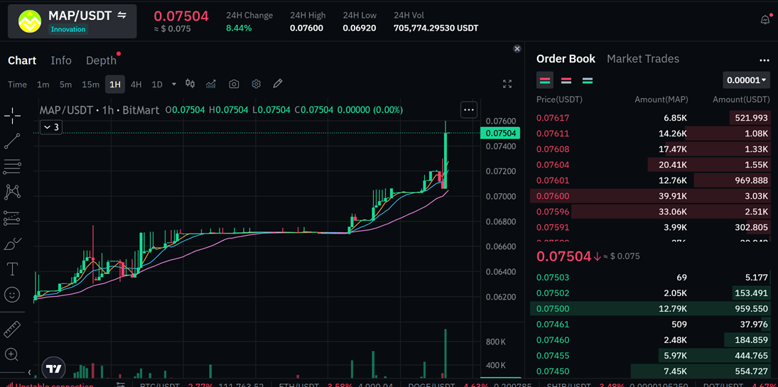 A wave of excitement is sweeping the market! MAP/USDT has just set a new record, officially breaking through the resistance level and setting a new high at $0.07600! With a staggering 8.44% growth and a trading volume of 705,774,295 USDT in just 24 hours on BitMart, it is clear that MapNode is not just growing – we are redefining the potential in the DeFi space!
